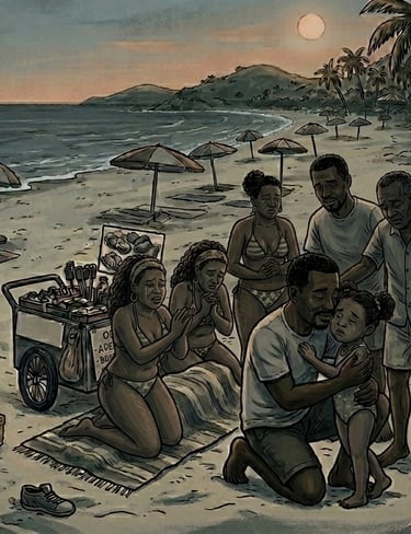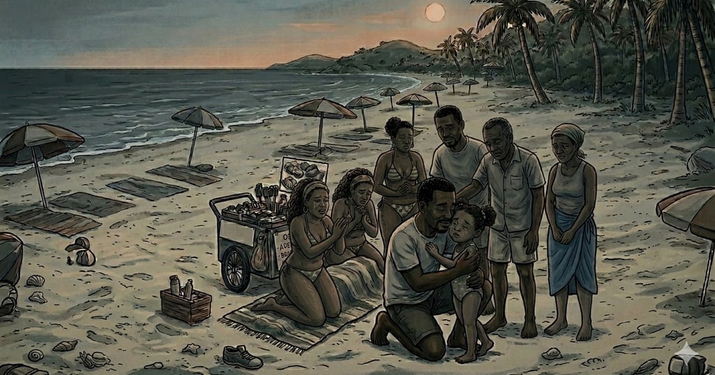 El cuerpo atlético del salvavidas atravesó la playa a toda velocidad, tiró el megáfono a la arena, se zambulló y nadó hacia los bañistas, mientras en la playa una muchacha rubia, con cuerpo de Afrodita y cara de lechuza, propinaba una sonora cachetada —pa que aprenda a respetar— a un mulato que se atrevió a manosear su prominente fundillo, embadurnado de sudor, arena y aceite de coco. El insolente, con una sonrisa maliciosa, se sobó la mejilla y se alejó cantando al son de Beto Zabaleta: «Acércate hacia mí sé más amable //Abrázame mujer pa que se acabe // El tormento fatal que dentro tengo»…