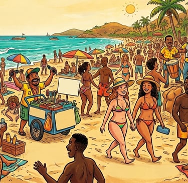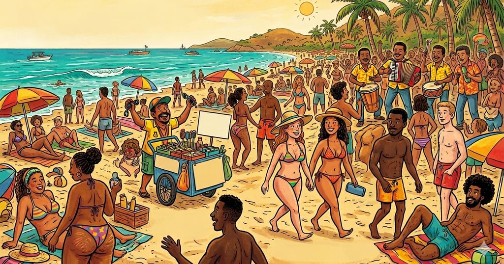 El domingo playero, como de costumbre, era un carnaval de colores de trajes de baño, aromas de pescados y mariscos, y bullicios de vendedores ambulantes que ofrecían, desde gafas raiban legítimas a cinco mil barras, hasta masajes milagrosos por lo que usted me quiera dar. Un conjunto vallenato no cesaba de volar hacia la casa en el aire o quejarse de las angustias de Jaime Molina. Luego apareció la voz de Beto Zabaleta: