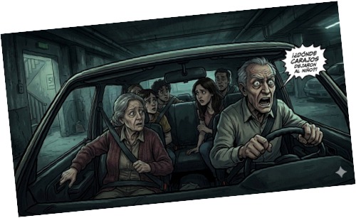 Por fin, aparecieron las llaves. Salieron en forma atropellada del apartamento. Tenían que llevarlo a la clínica más cercana. Corrieron hacia el ascensor, pero se dieron cuenta de que no servía. Gritaron que había que bajar las escaleras. Estaban en el quinto piso. Como locos, corrieron escaleras abajo. Llegaron al estacionamiento. Cual manada de potros salvajes, atropellándose unos a otros, entraron al carro. El abuelo prendió el motor. Miró hacia atrás para cerciorarse de que tuvieran ajustado el cinturón de seguridad. Con ojos desorbitados y sin poder creer lo que estaba viendo, gritó: ¿Dónde carajos dejaron al niño?